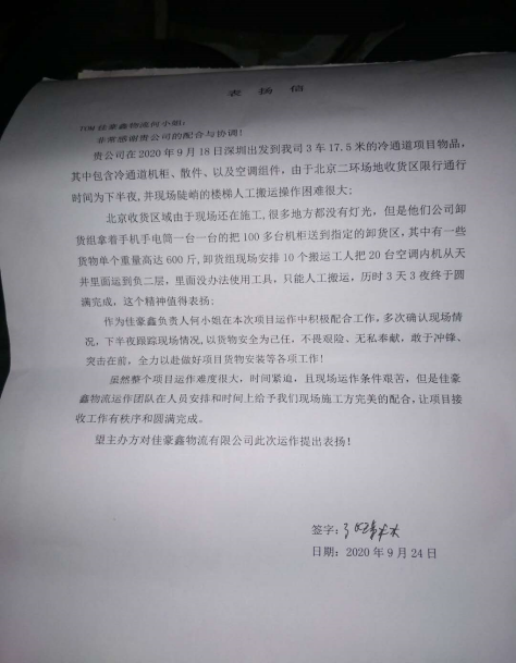雖然整個項目運作難度很大,時間緊迫,且現場運作條件艱苦,但是佳豪鑫物流運作團隊在人員安排和時間上給予我們現場施工方完美的配合,讓項目接收工作有秩序和圓滿完成。